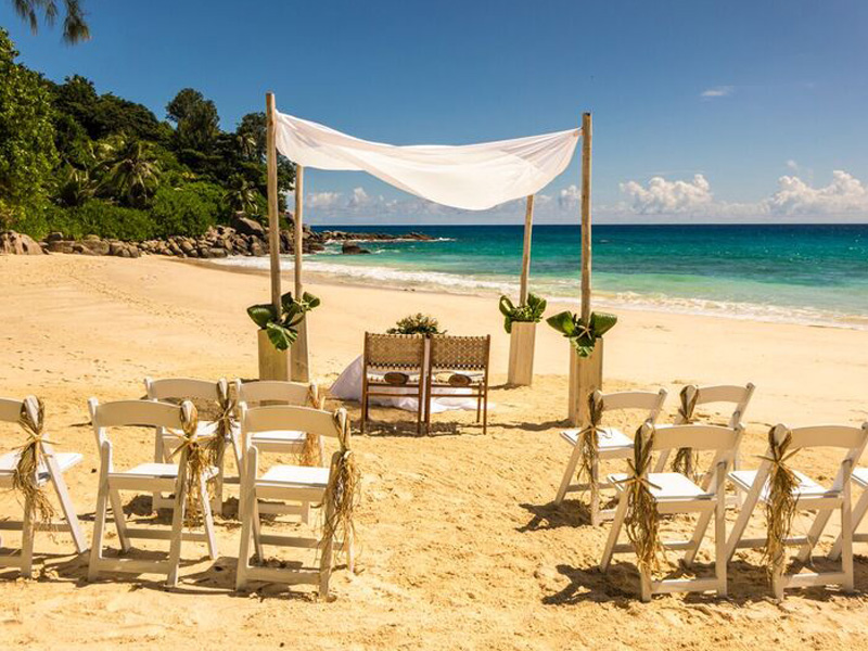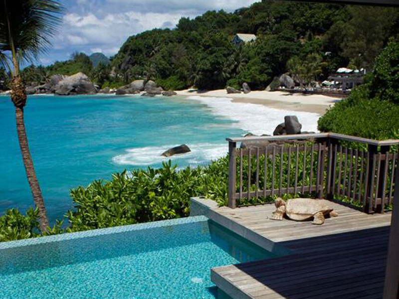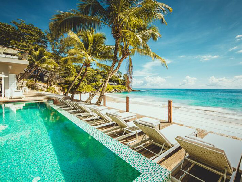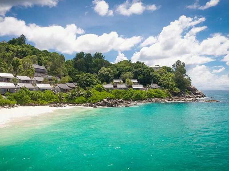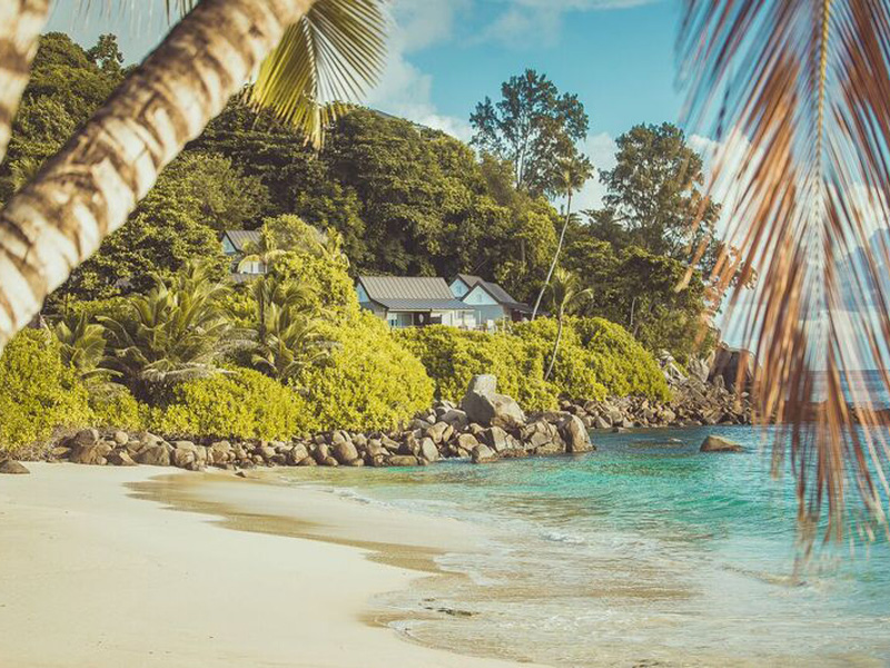 Im Norden der Insel Mahé auf den Seychellen in traumhafter Strandlage; eingebettet in einen üppigen tropischen Garten.