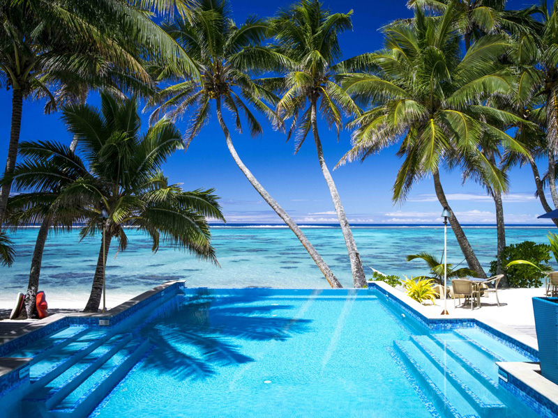 Auf den Cook Inseln am wunderschönen weißen Sandstrand von Titikaveka im Süden von Rarotonga. Einige Restaurants und ein kleiner Supermarkt befinden sich in der Nähe. Die Entfernung zum Flughafen Rarotonga beträgt ca. 15 km.