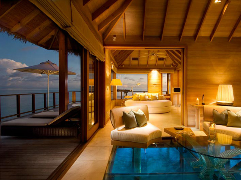 Sunrise Water Villa (auf Rangali): ca. 80-90 qm, Wasserbungalow auf Stelzen über der Lagune erbaut mit direktem Zugang zum Meer, auf der Sonnenaufgangsseite, kombinierter Wohn- und Schlafbereich, Bad mit Dusche und Badewanne, Bademantel, Badeslipper, Föhn, Minibar, Kaffee- und Teestation, Klimaanlage, TV, Whirlpool und großzügigem Sundeck.