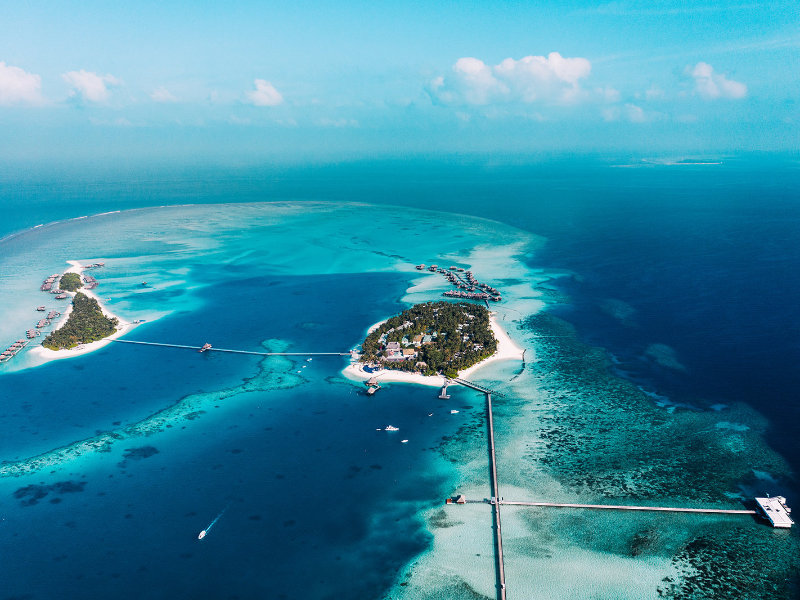 Auf den durch einen Steg verbundenen Inseln Rangali (ca. 460 x 230 m) und Rangalifinohlu (ca. 530 x 120 m) im Süd Ari Atoll auf dem Malediven mit wunder-schönem Hausriff.