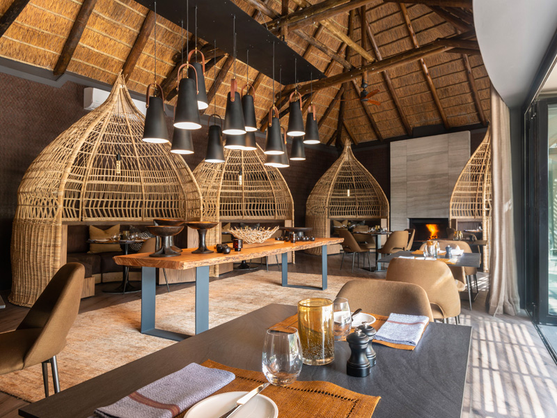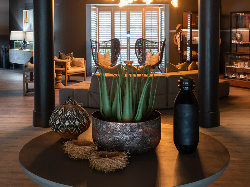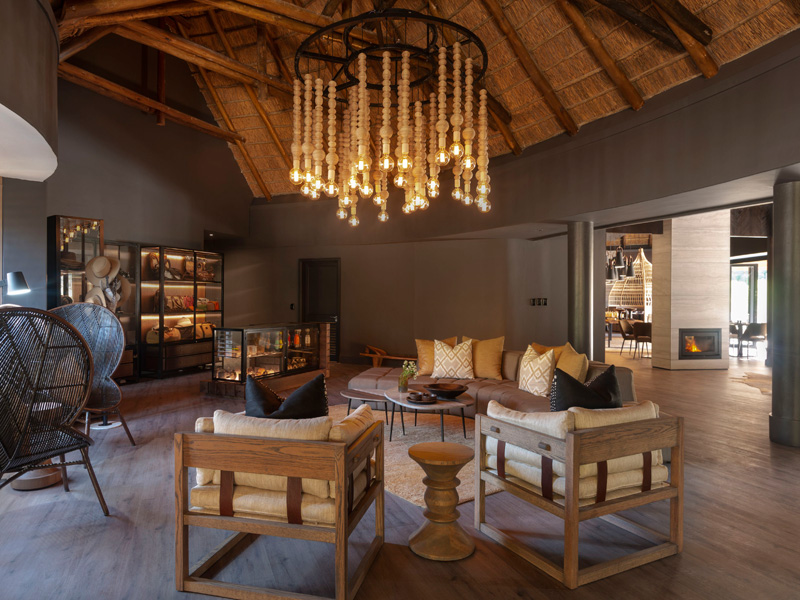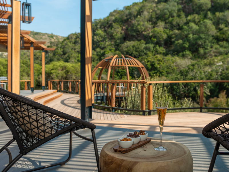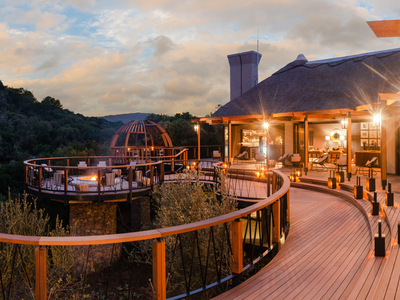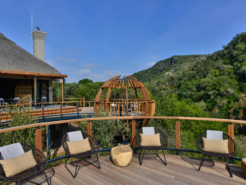 Bayethe Tented Lodge mit In- und Outdoor Speisebereich, Loungebereich mit TV, schöner Aussichtsterrasse, Geschenk-Boutique und Spa-Bereich mit Sauna.